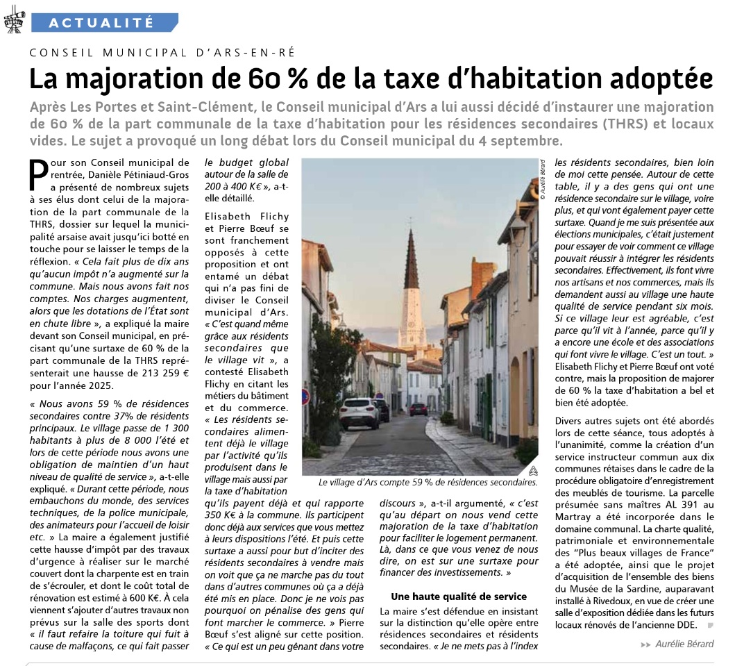 J’ai lu avec beaucoup d’intérêt l’article intitulé « Combien la taxe d’habitation devrait-elle rapporter à votre commune ? » paru dans l’édition datée du 12 novembre 2025 du « Phare de Ré ».