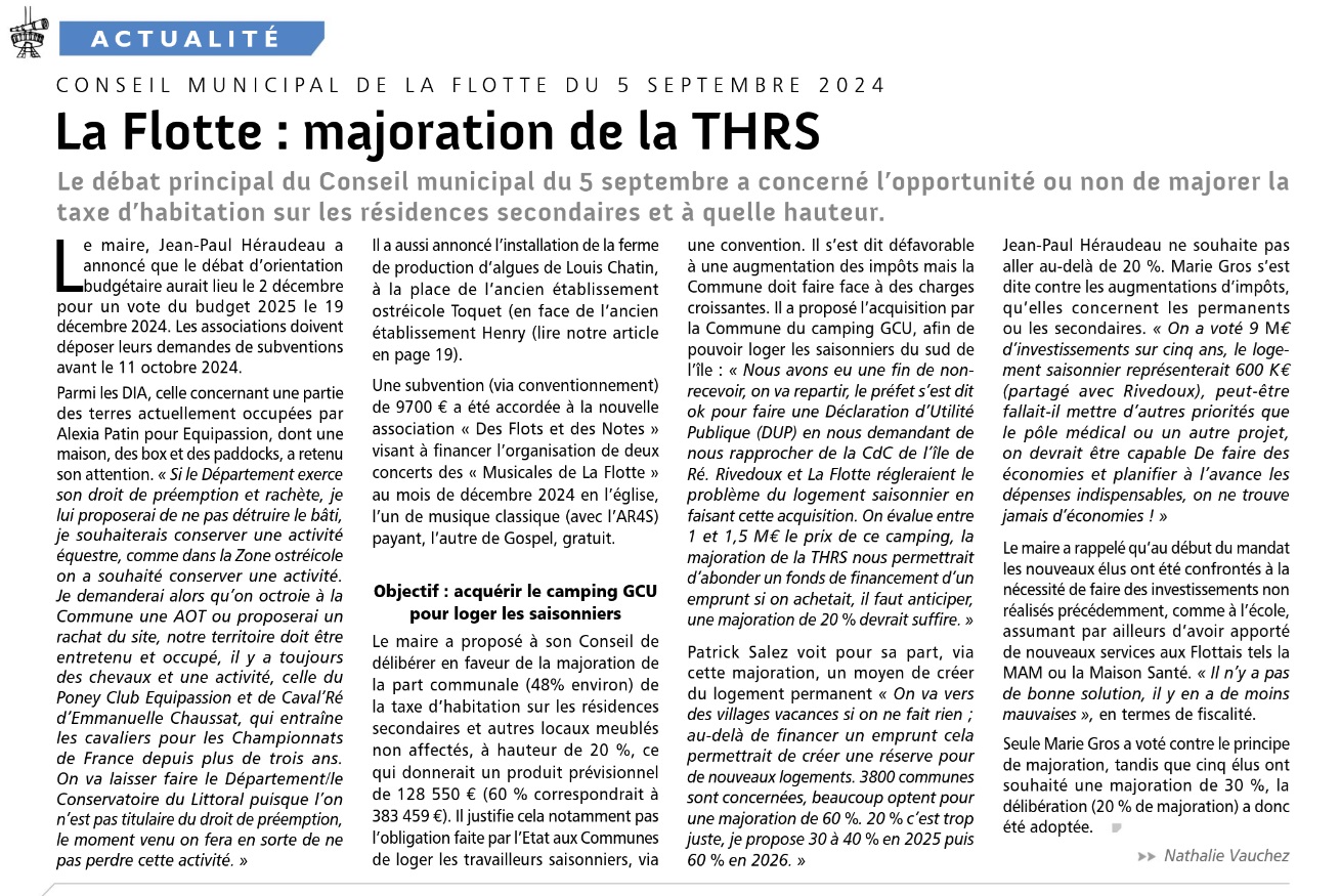 J’ai lu avec beaucoup d’intérêt l’article intitulé « Combien la taxe d’habitation devrait-elle rapporter à votre commune ? » paru dans l’édition datée du 12 novembre 2025 du « Phare de Ré ».